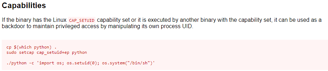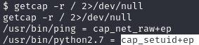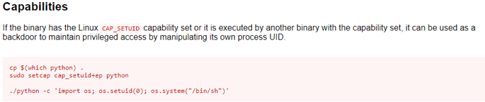 Tras revisar diferentes aspectos, como permisos en los binarios o capabilities, encontramos que python2.7 tiene cap_setuid habilitado, lo que permite escalar a root. Pare ello nos apoyamos el recurso gtfobins.