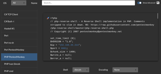 Utilizamos RevShells y seleccionamos PHP PentestMonkey.